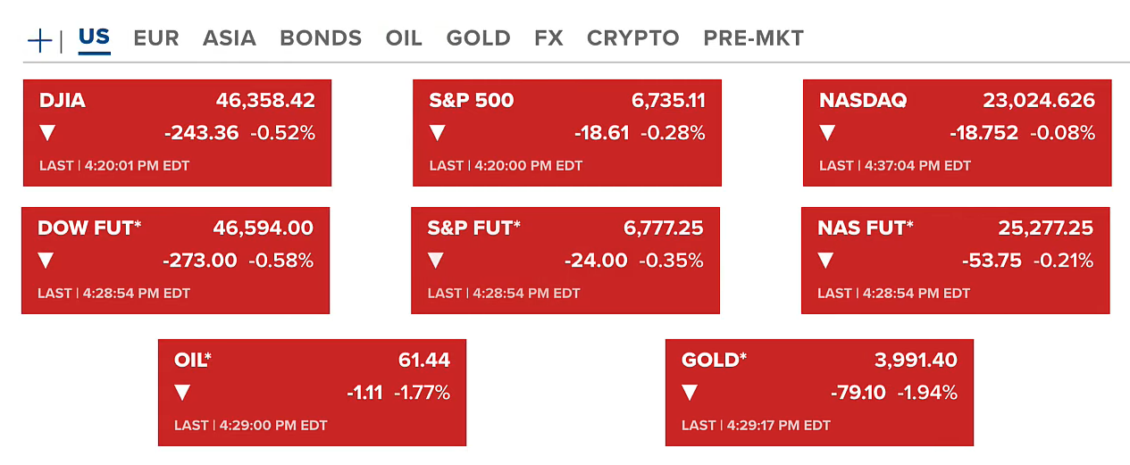 US equities closed lower across all three indices on Thursday (October 9th, US), with the Dow Jones dropping the most at 0.52%. Stock futures also continued to decline. Oil contracts fell to $61.4 per barrel. Gold corrected to $3991 per ounce after recently hitting a new peak.