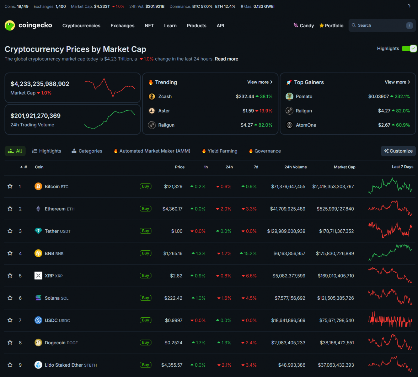 Bitcoin corrected to $121,000. Most major altcoins also saw declines. The overall crypto market capitalization fell to $4.23 trillion.